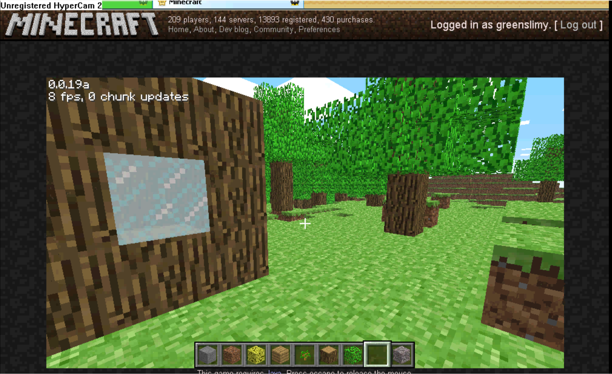 When Notch first added glass to the game - in the version 0.0.19a, people told him it looked more like ice, so he quickly changed it in 0.0.19a_01 to the well known glass texture that has been in the game until the Jappa-fication. Up till today, we had only known this first glass texture as a few blue-ish pixels from far away, which changed with greenslimy finding a video on his old hard drive, featuring himself building a small house - in the version 0.0.19a. It's a good thing he built it with windows, since thanks to him, we now have a very good idea on how the glass looked. Here's the video in it's full Windows XP glory.